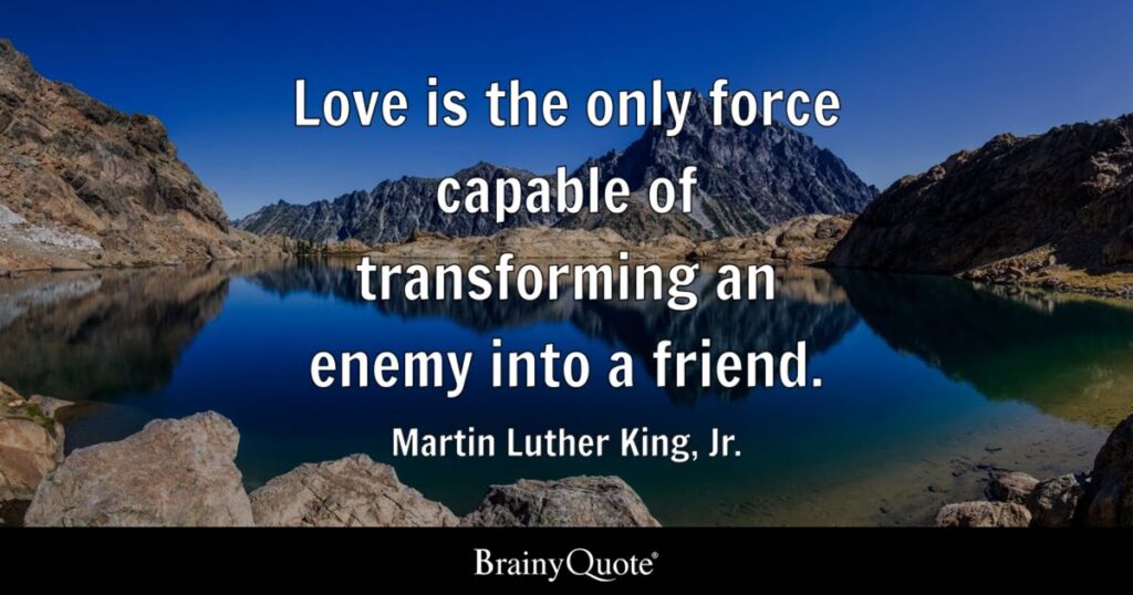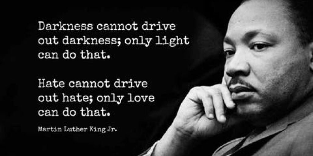 “The ultimate weakness of violence is that it is a descending spiral begetting the very thing it seeks to destroy, instead of diminishing evil, it multiplies it. Through violence you may murder the liar, but you cannot murder the lie, nor establish the truth. Through violence you may murder the hater, but you do not murder hate. In fact, violence merely increases hate. Returning violence for violence multiplies violence, adding deeper darkness to a night already devoid of stars. Darkness cannot drive out darkness; only light can do that. Hate cannot drive out hate; only love can do that.”